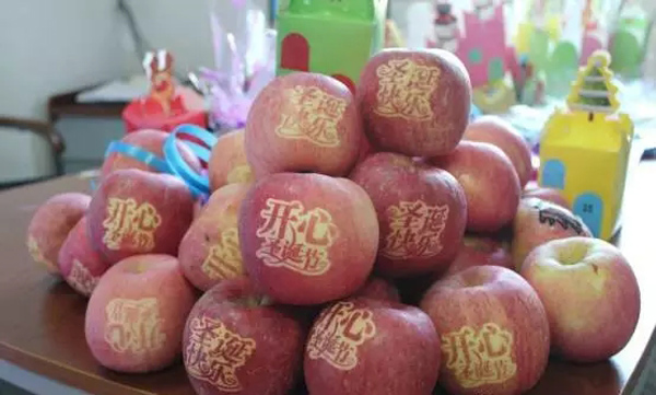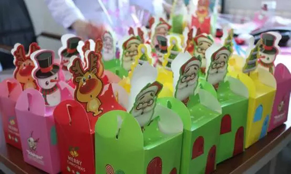 经过近两小时的忙碌,数百个印有“圣诞快乐”“欢乐平安夜”“开心圣诞节”的大红苹果变成了包装精美的礼盒,五颜六色,缤纷可爱。